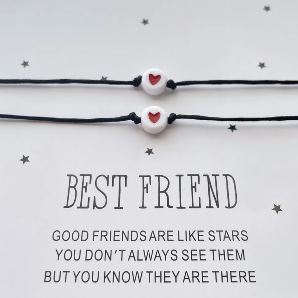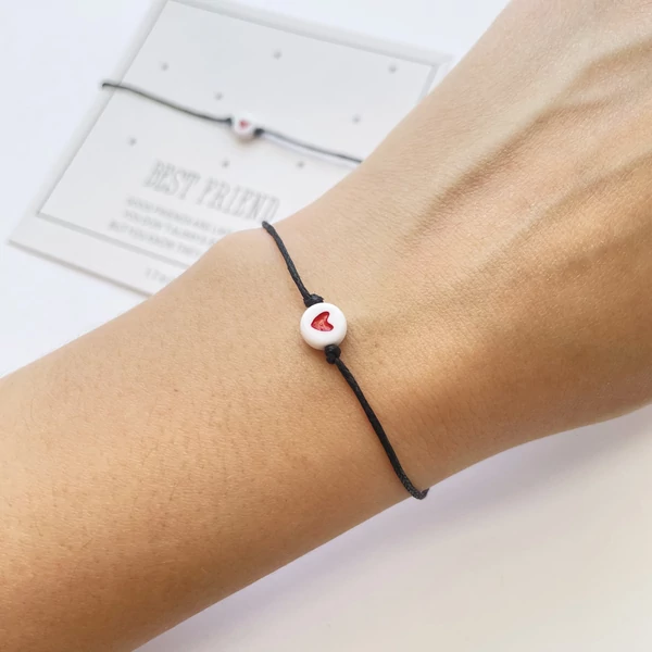 Fekete zsinórból készült barátság karkötő szett, középen piros szíves gyönggyel díszítve.