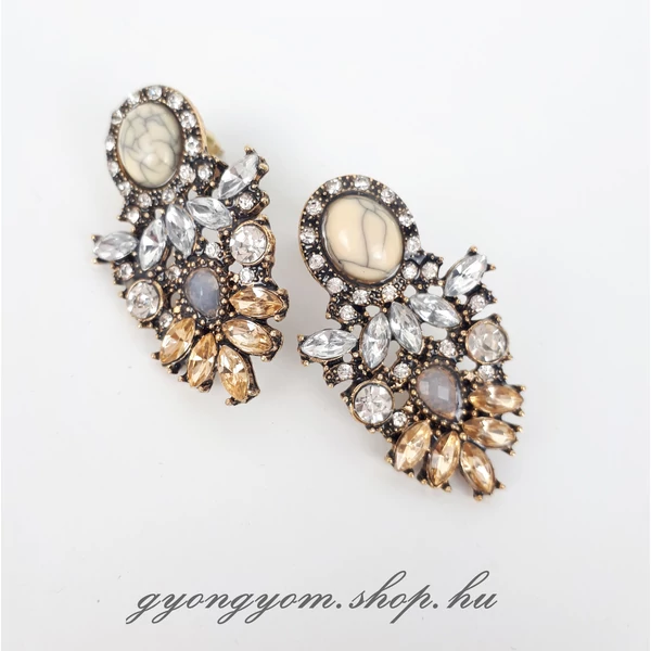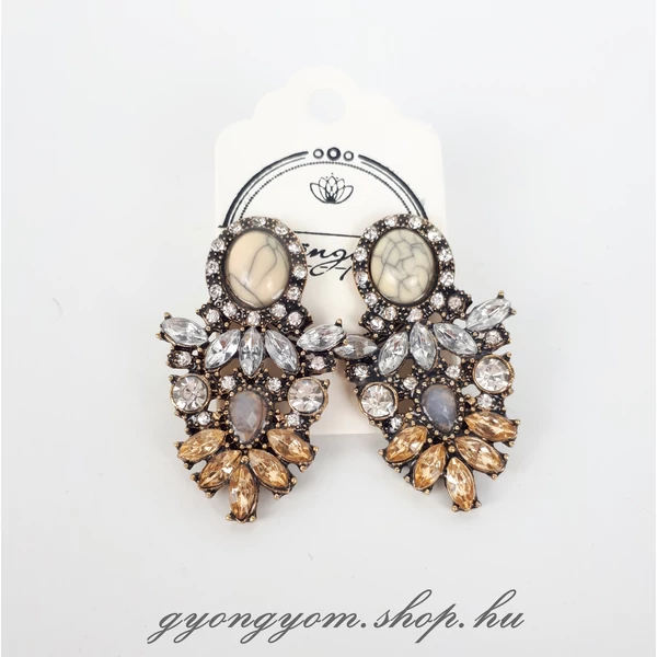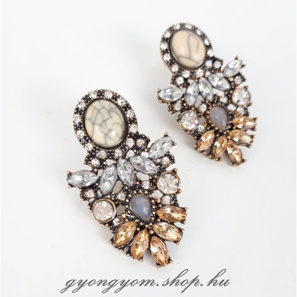 Feltűnő és elegáns fülbevaló, középen márvány mintás kő díszítéssel, körülötte bézs, ezüst, és bronz színkombinációval.