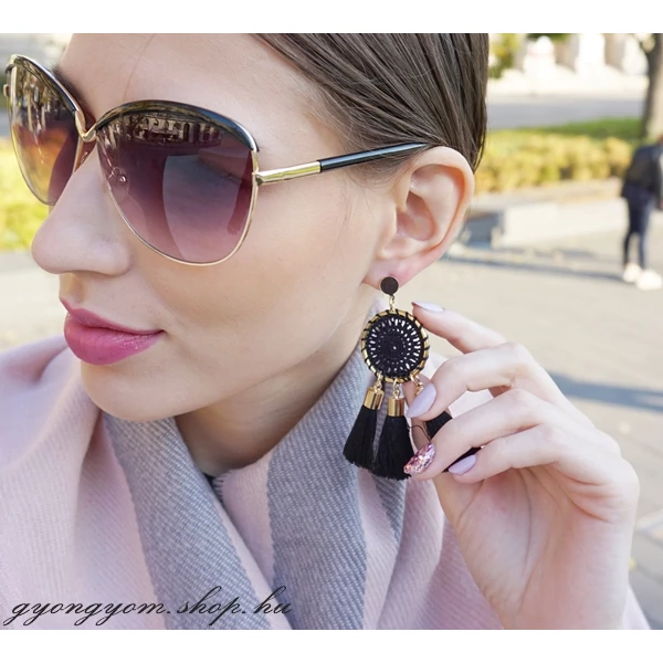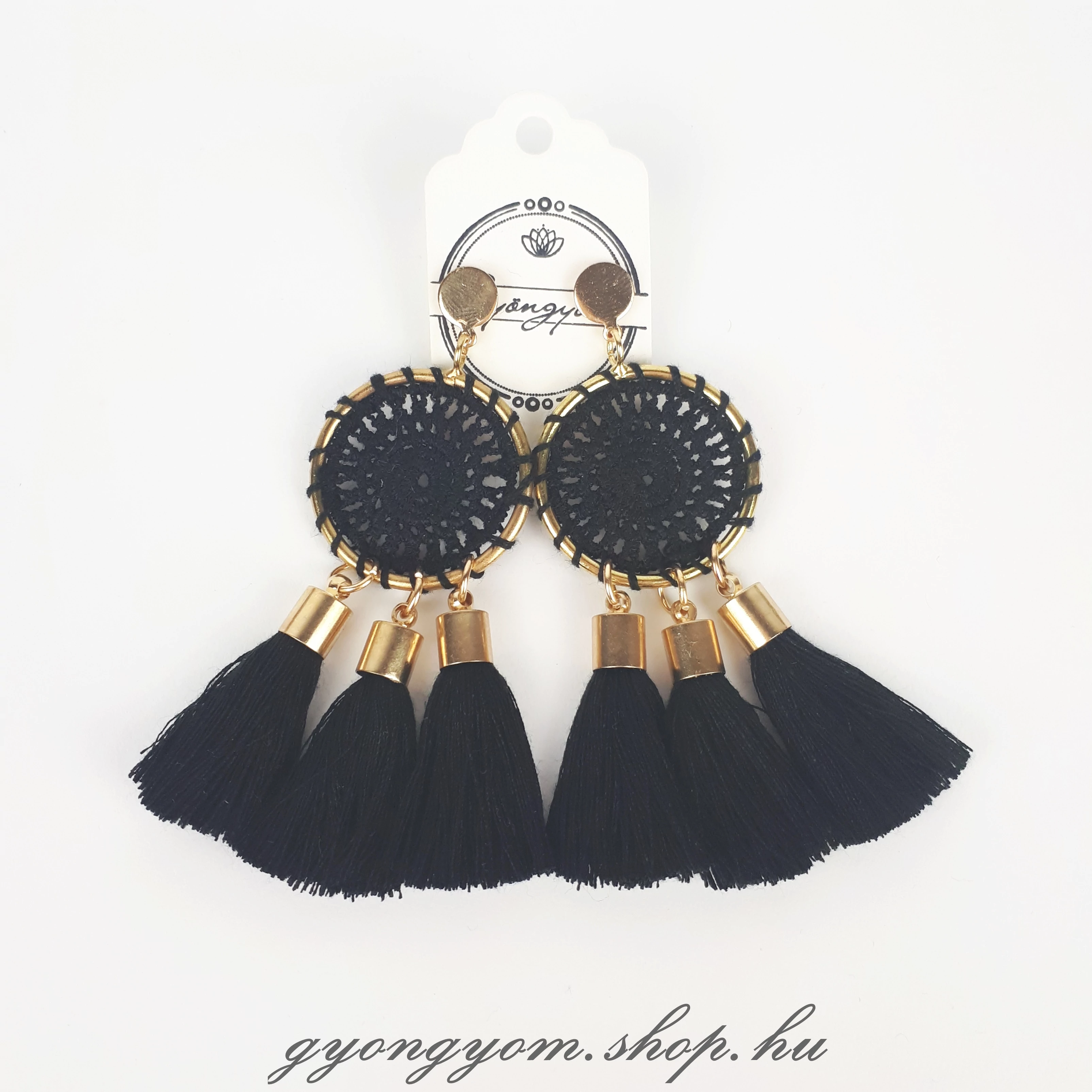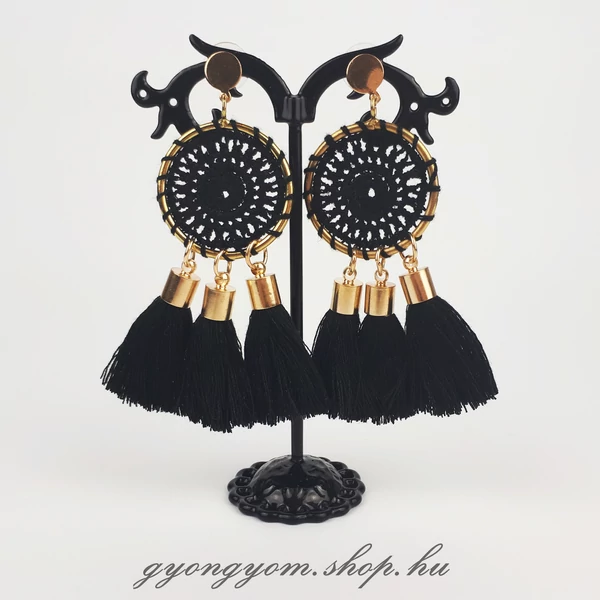 Fekete színű, álomfogó formájú bohém rojtos fülbevaló, arany színű fém részekkel. Az arany és fekete klasszikus kombinációja bármilyen öltözékhez kitűnően passzol!