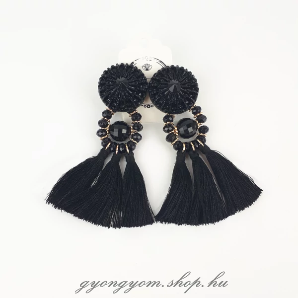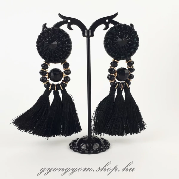 Feltűnő statement fülbevaló fekete színben, rojtokkal díszítve, arany színű részletekkel.