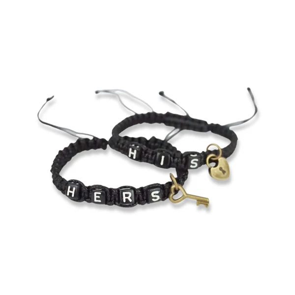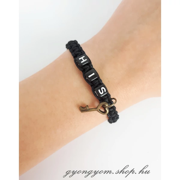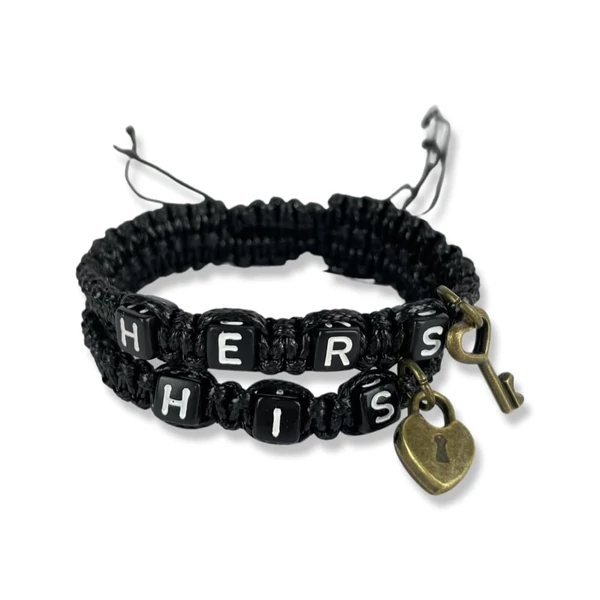 Páros karkötő fekete színben, fekete alapon fehér His és Hers felirattal, kulcs és szív alakú lakat függővel díszítve. Lepd meg vele szerelmedet az évfordulótokon vagy Valentin-napon!