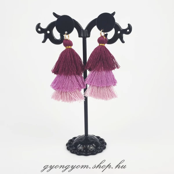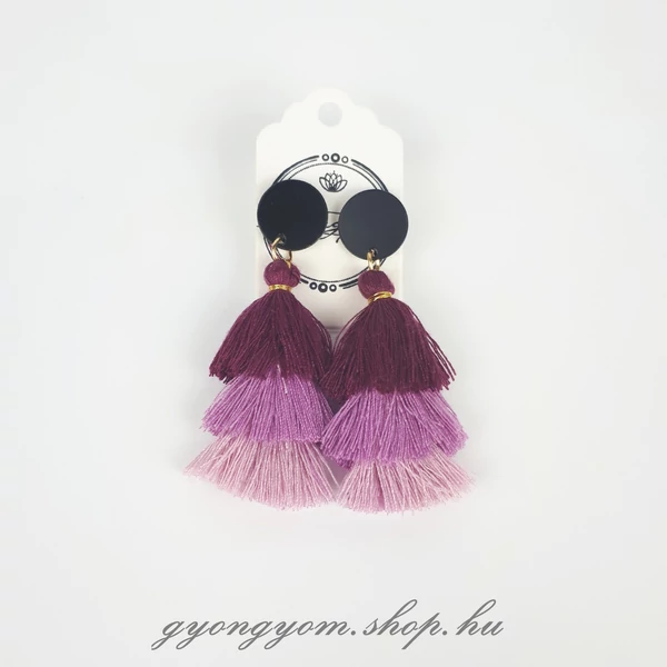 Textil szálakból készült, lila árnyalatú rojtos fülbevaló, fekete felfüggesztésen.