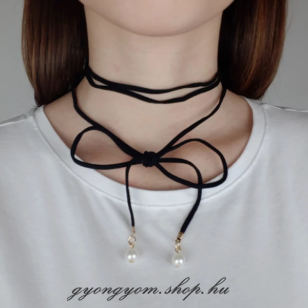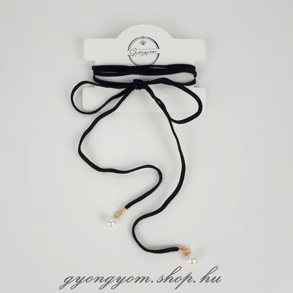 Fekete vékony nyakpánt, gyöngyös véggel. Többféleképpen is hordható: megkötve, masniban, körbetekerve.